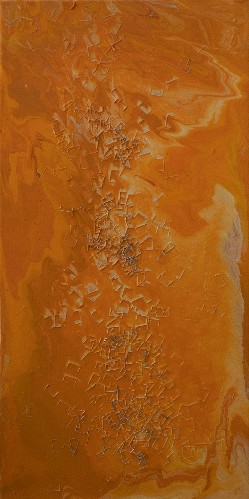 After playing around with pastels and some paint, I decided to dive deeper into the relationship of color and texture. I used acrylic and oil-based paints of different sheens together to see how they interacted on the canvas. Then to create more texture in certain pieces I added staples not only to create mountains and valleys, but also to tear through the layers of paint to show what is beneath. I had a lot of fun making these and seeing what would unfold since I never knew what the finished piece would look like.